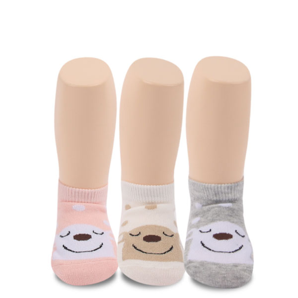 눈이 내리는 듯한 땡땡이패턴에 미소를 머금고 있는 귀여운 곰이 있는 베이비 양말입니다.